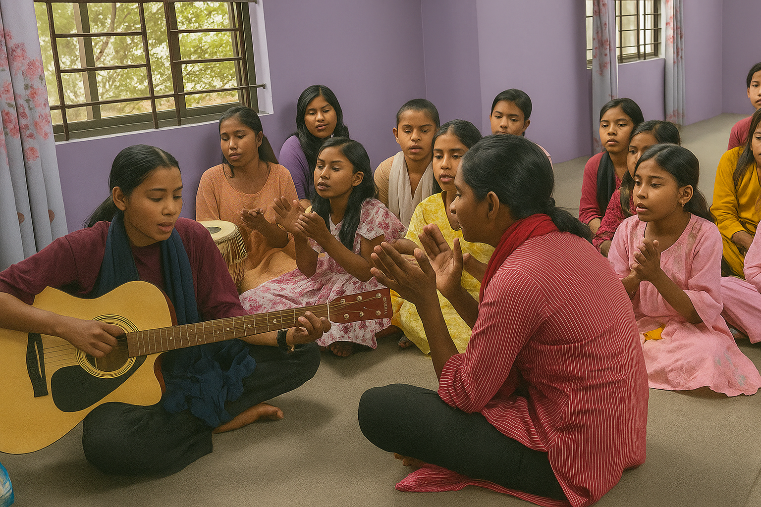 This image shows girls participating in the music program at the Bangladesh Safe Haven. To protect the identities of children, staff and the locations of safe havens, Silent Bridge uses AI to subtly alter facial and geographic features.